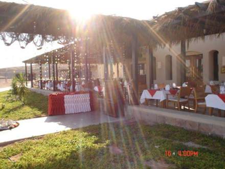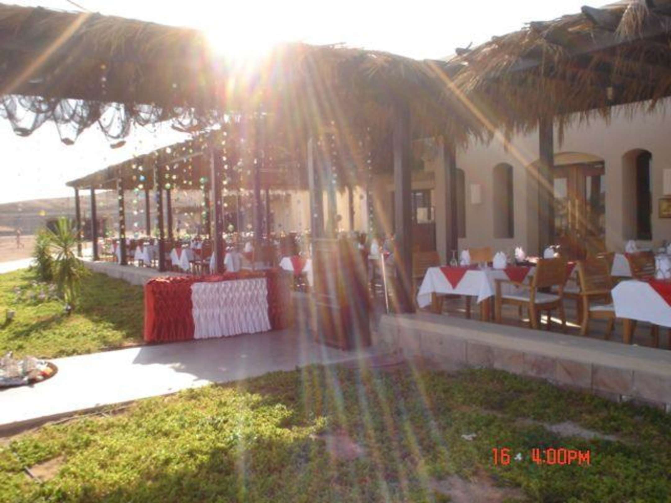 Sonne über dem Strandrestaurant