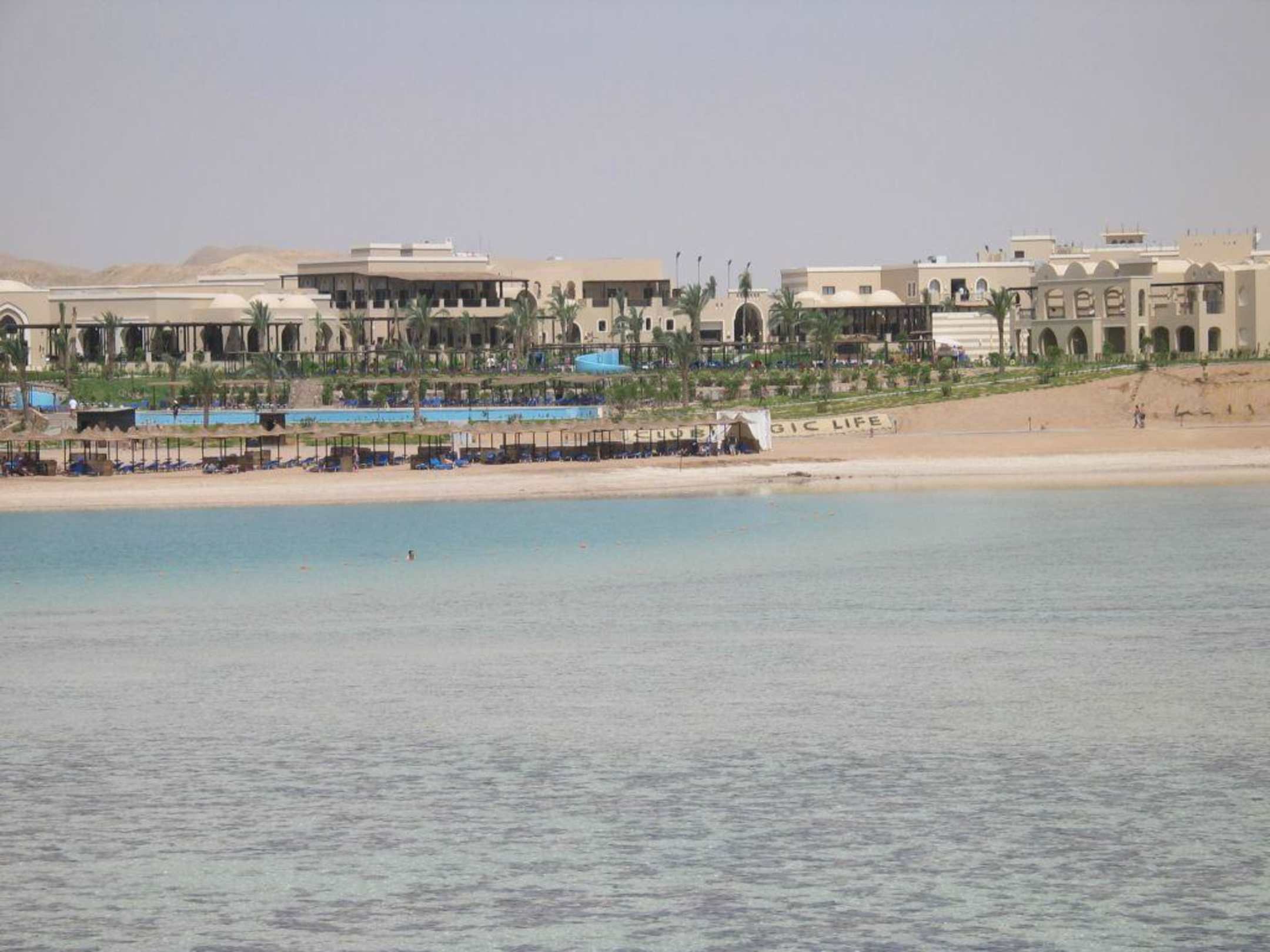 Hotelsicht vom Strand mit Pool und Rutsche