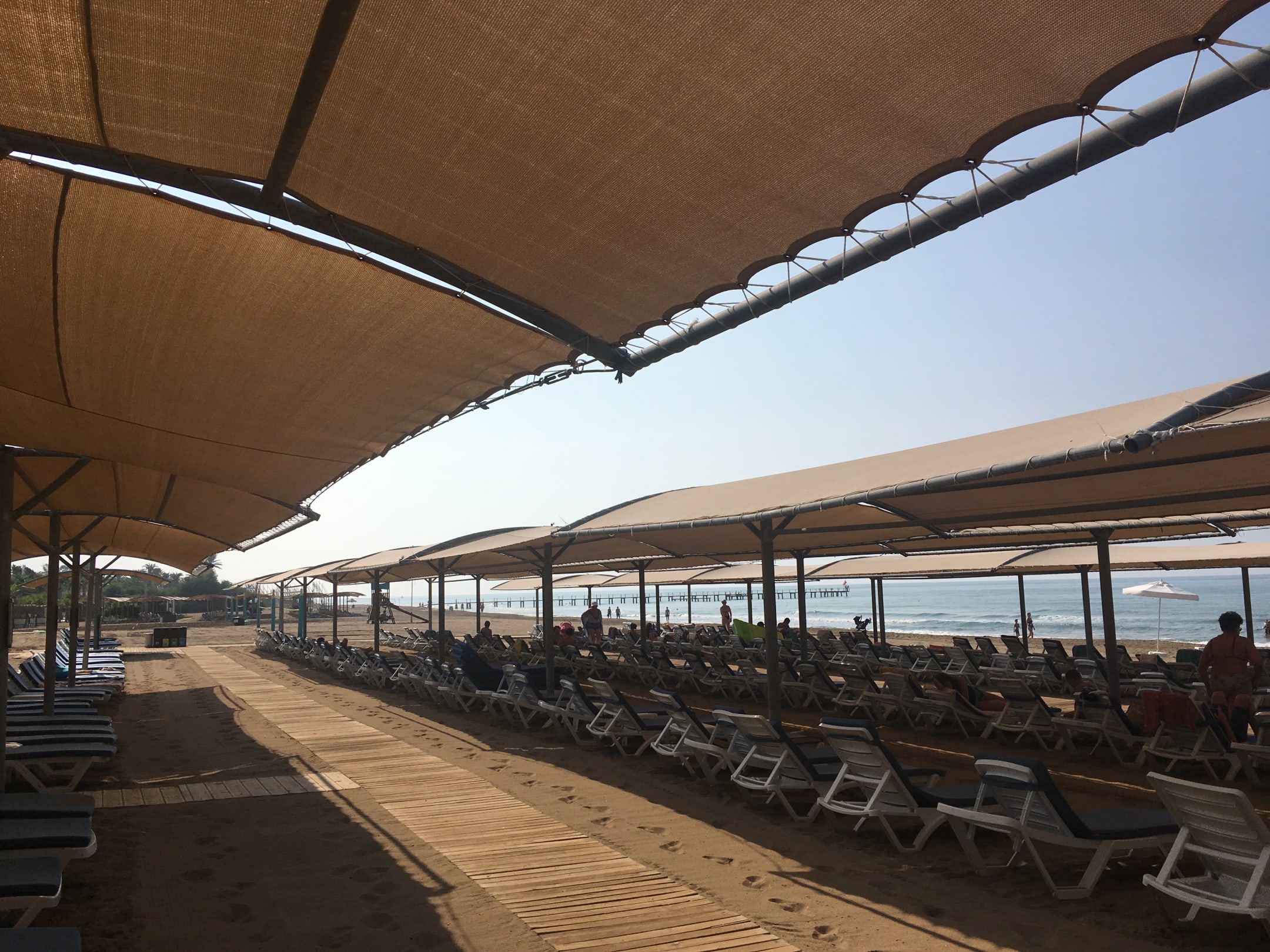Liegen und Beschattung am schönen Sandstrand. Ausreichend Liegen und Schatten.