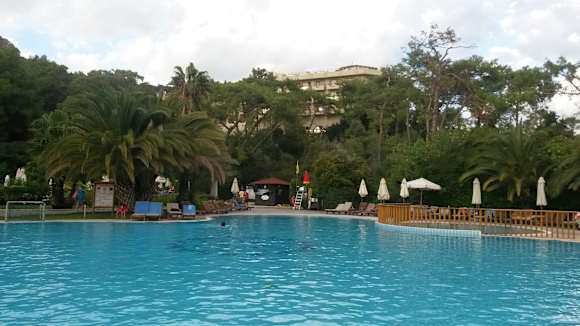 Blick vom Pool zum Hotel