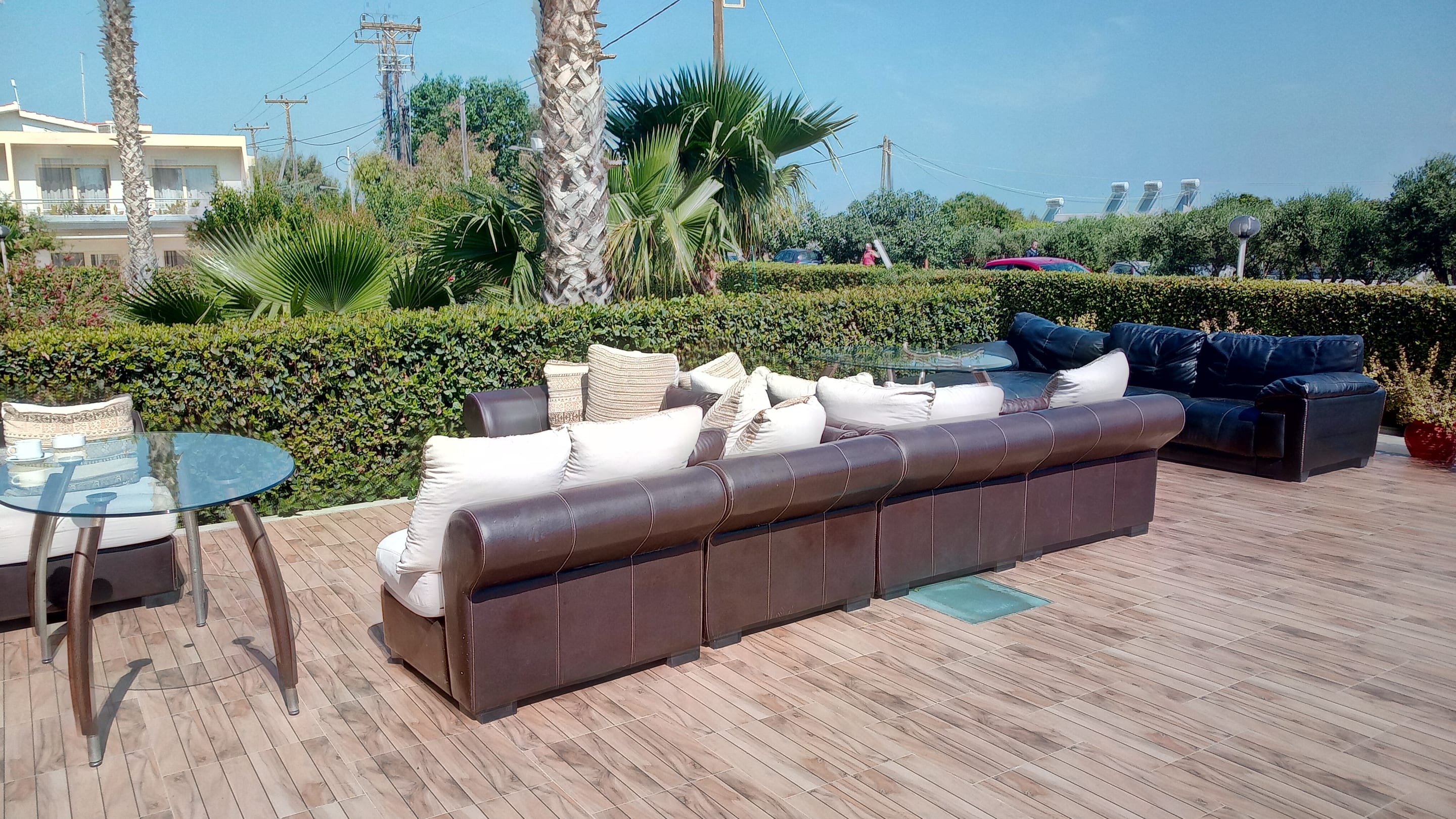 Loungebereich vor dem Eingang.
