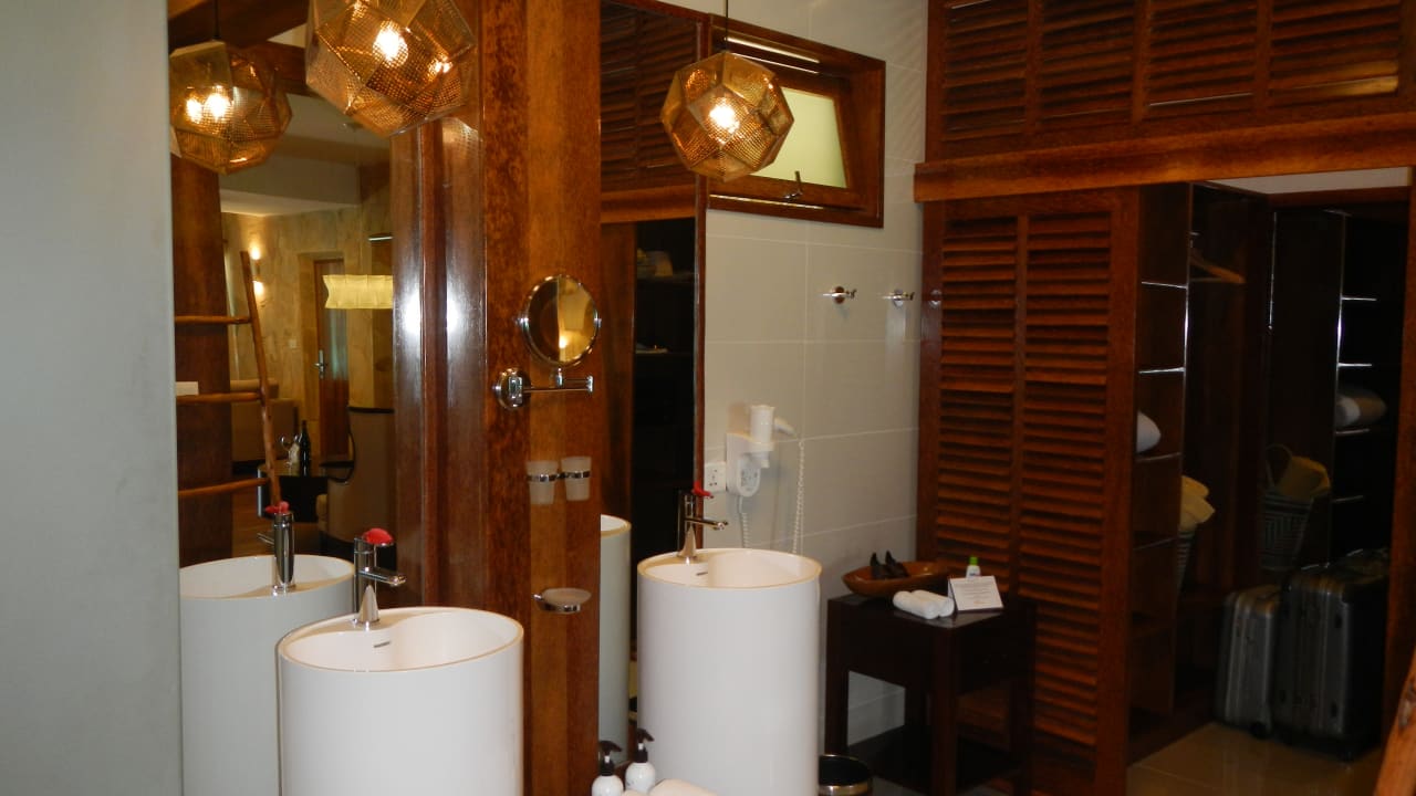 Die zwei Waschtische und rechts der begehbare Kleiderschrank.