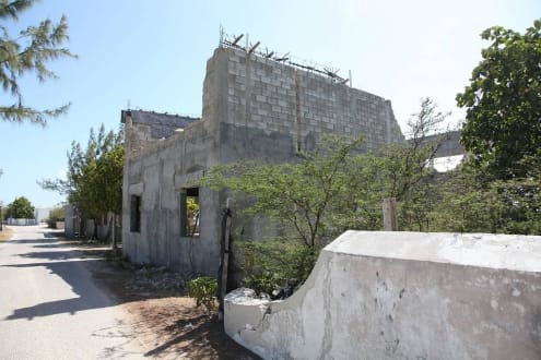 Der Direkte Blick zum Strand ist durch ein Verfallenes Haus hinter Bäumen versperrt, den Blick schräg zu Strand versperrt diese Bauruine