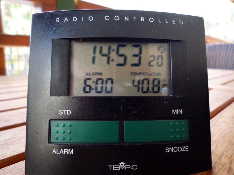 Wecker zeigt deutsche Zeit, und die Temperaturen gingen noch höher! Bis knapp 50°C!!!