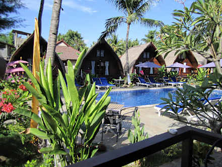 Blick vom Bungalow zur Poolanlage