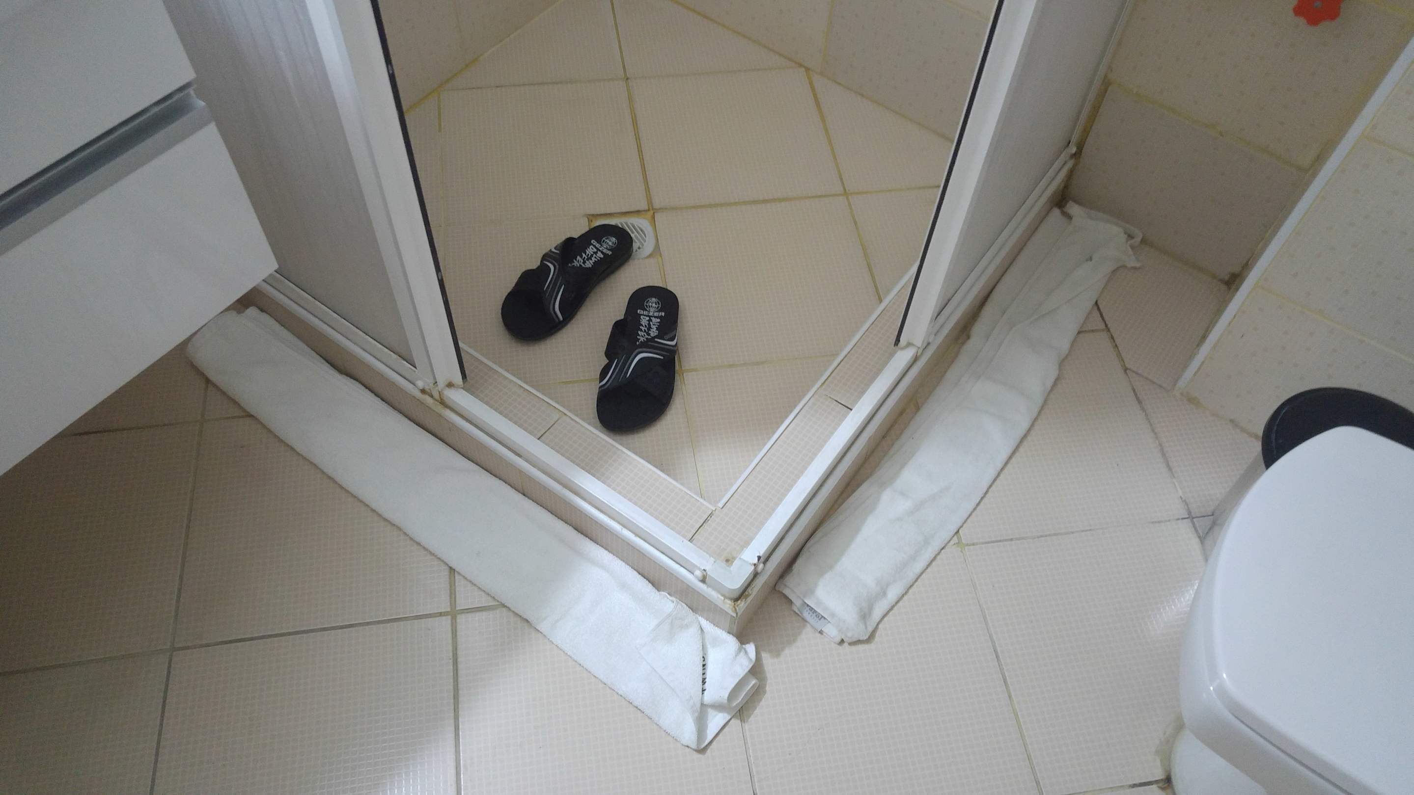 Dusche läuft komplett aus. Daher die Handtücher auf dem Boden