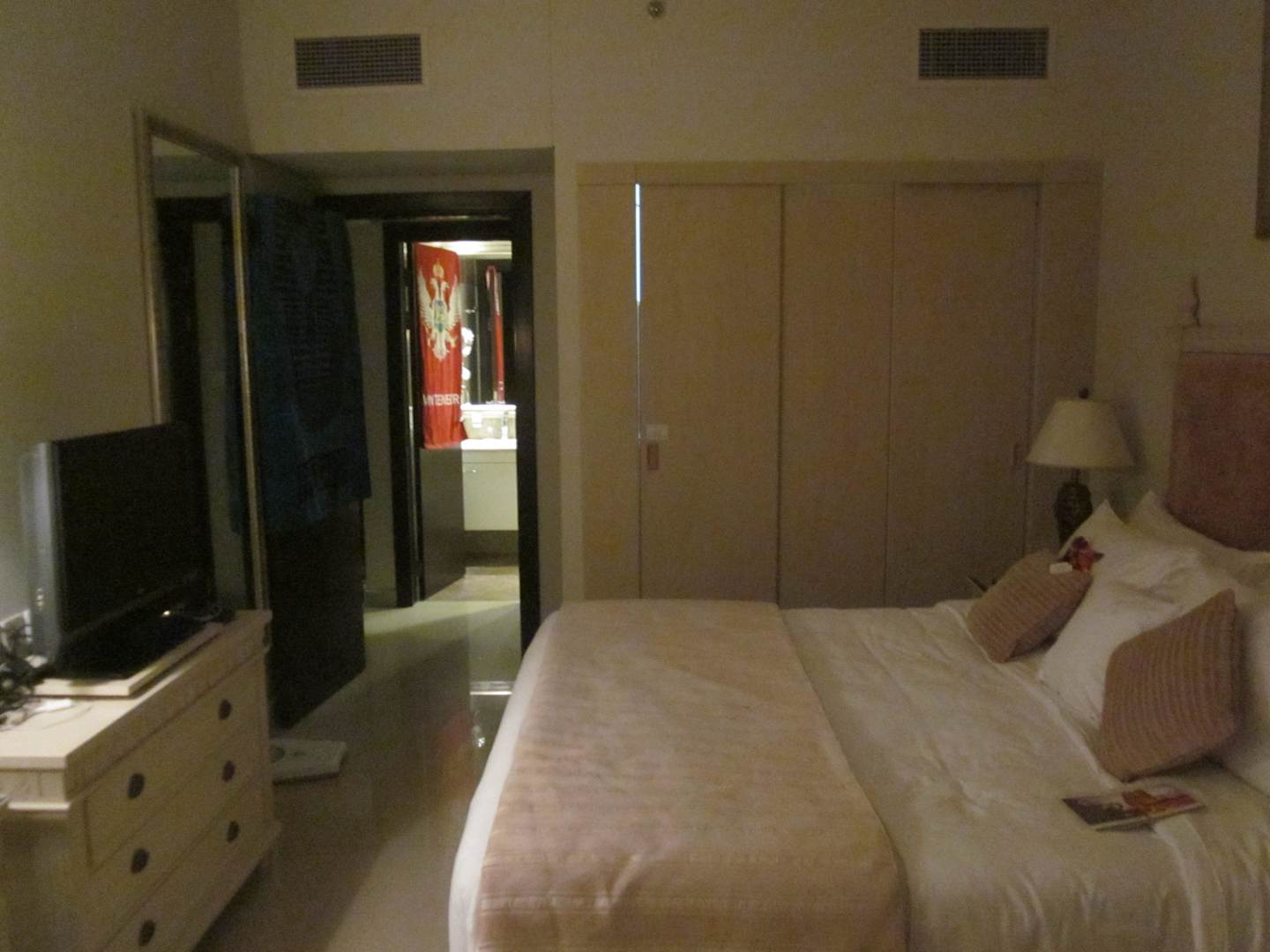 Schlafzimmer von 3611am Abend aufgenommen, im Hintergrund das Badezimmer