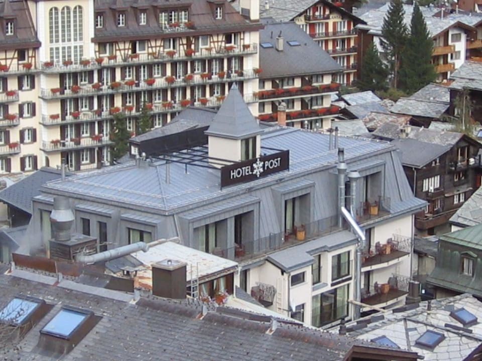 Das Hotel aus einem höheren Standort. Von den Zimmern auf der rechten Seite hat man einen herrlichen Blick auf das Matterhorn und das Zentrum des schönen Ortes Zermatt.