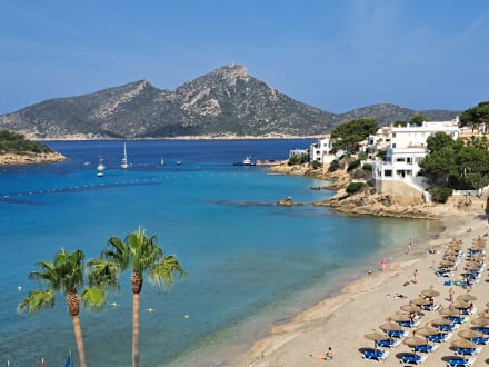 Blick von unserem Balkon auf den Strand und die Insel Dragonera
