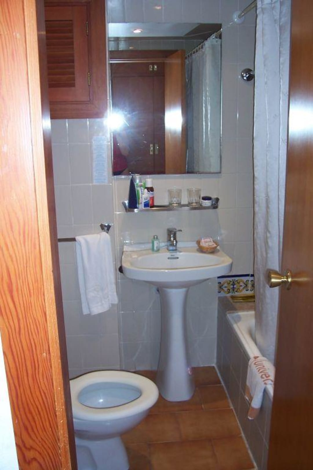 Dies ist das kleine Badezimmer. Frischluftzufuhr gibts nur über das Zimmer, die Wannendusche ist rechts, auf dem Foto allerdings durch die offene Tür verborgen. Alle Armaturen funktionierten bei unserem Aufenthalt einwandfrei.