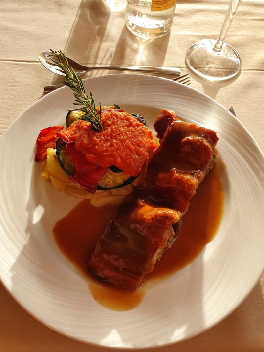Mallorquinisches Tumbet (geschichtetes Gemüse) mit Spanferkel