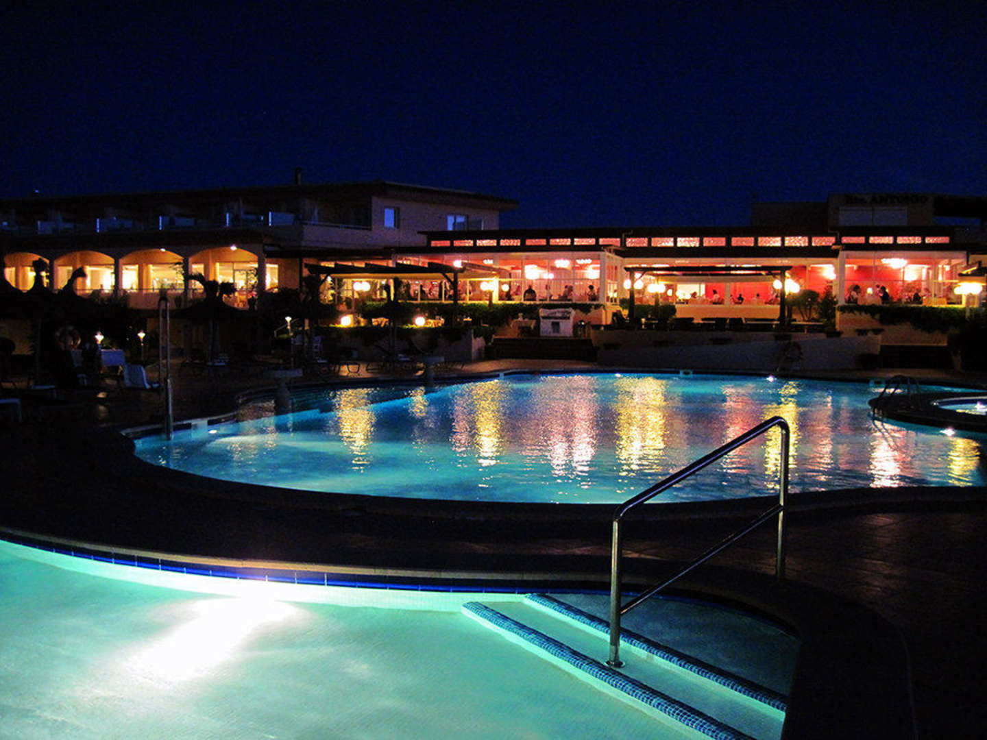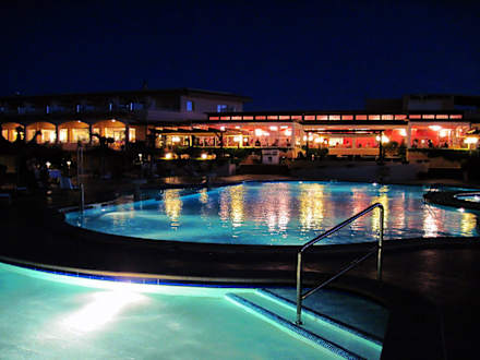 Blick über die Poolanlage auf das Restaurant zur Zeit des Abendessens.