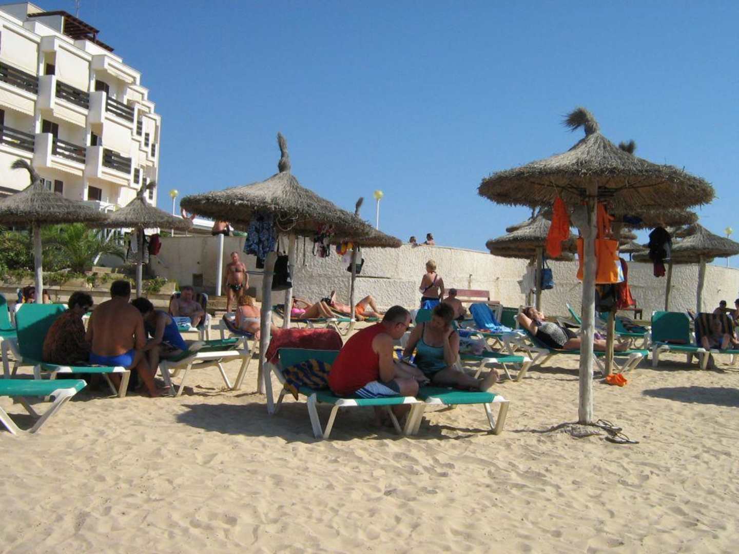 Blick nachmittags auf den Hotel eigenen (aufgeschütteten) Sandstrand
