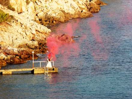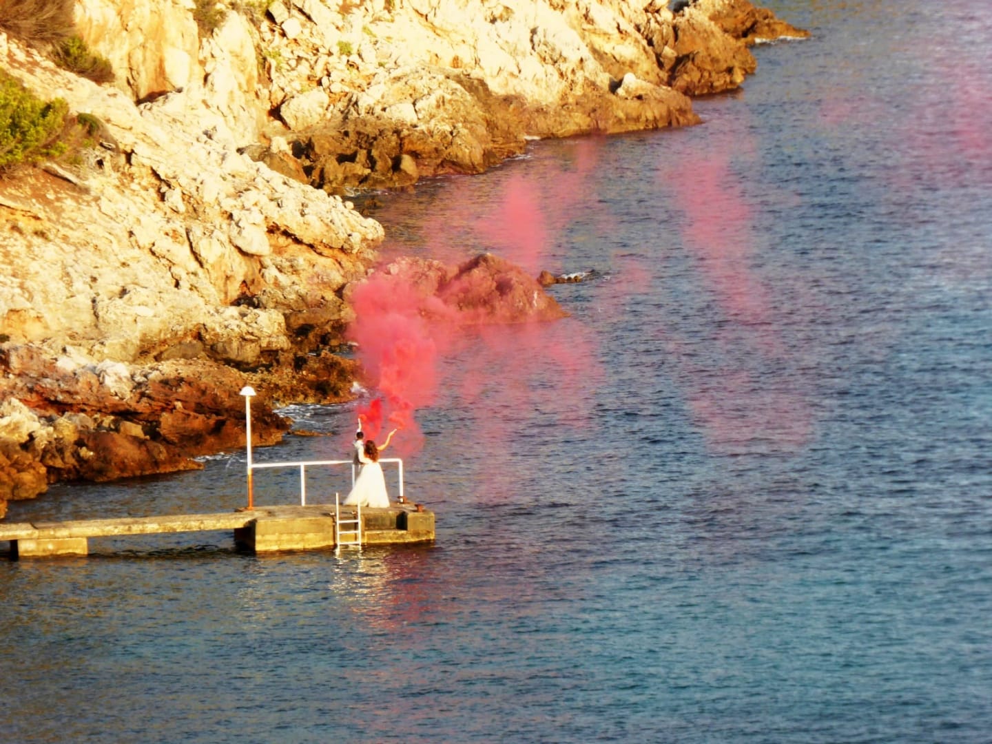 Brautpaar auf dem Steg, beobachtet vom Balkon