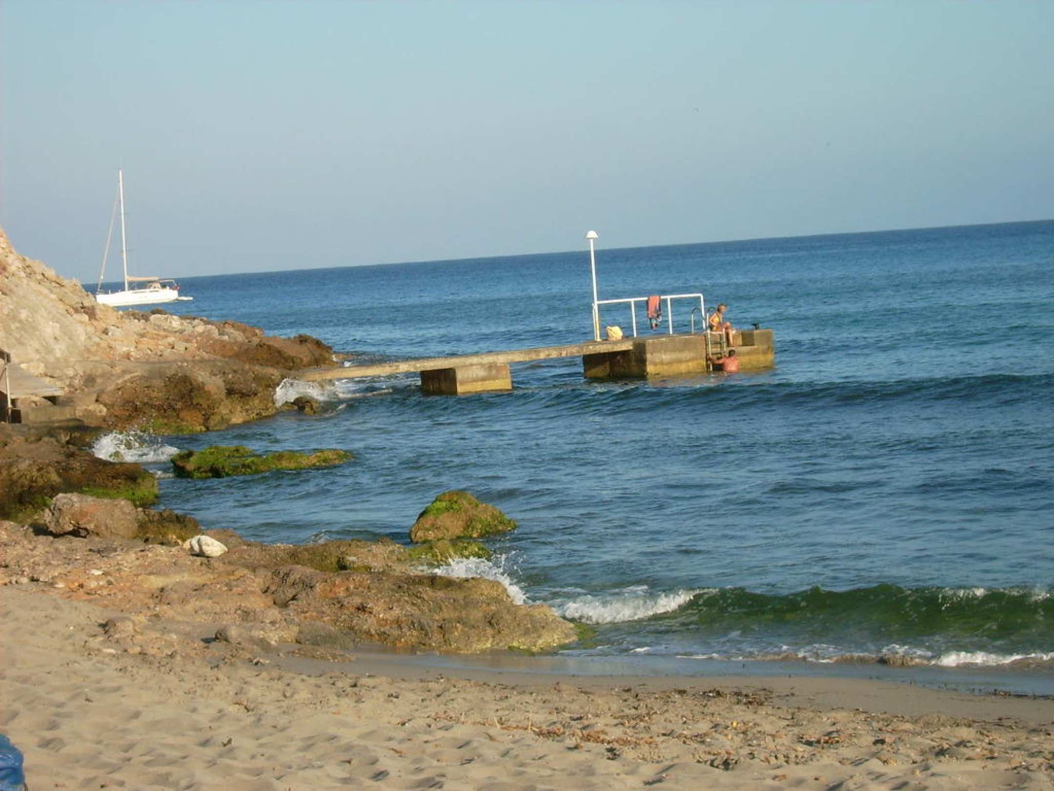 Felsküste mit Steg auf der linken Strandseite, vom Hotel aus gesehen
