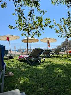 Ein schattiger Platz unter Bäumen im Garten des Universal Hotel Castell Royal.