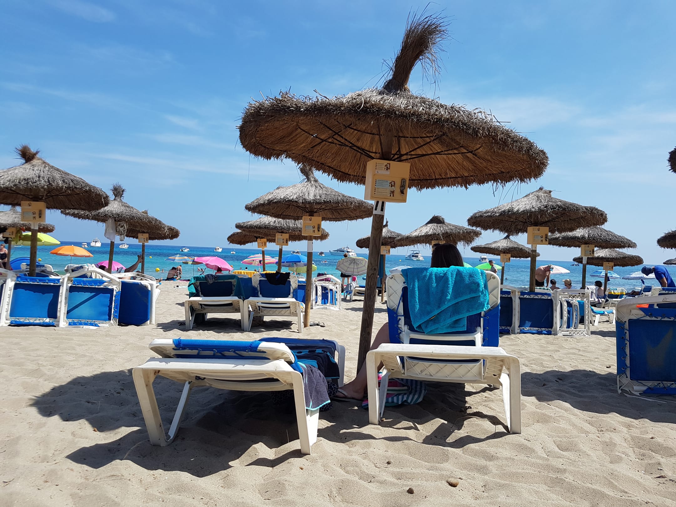 Der Strand, 2 Liegen mit Schirm kosten 16.50Eur am Tag