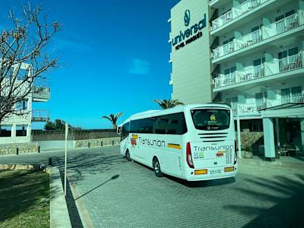 Vor dem Haupteingang steht ein Bus für die Touristische Unternehmungen