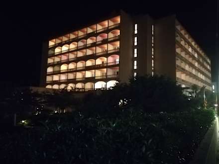 Das Hotel bei Nacht. Strassenansicht