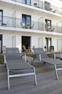 Die Terrasse im zweiten Stock in Richtung Garten / Wald ist sehr groß. Die Liegestühle teilt man mit anderen Hotelgästen. Die Balkone der darüber liegenden Stockwerke sind ebenfalls zu sehen.
