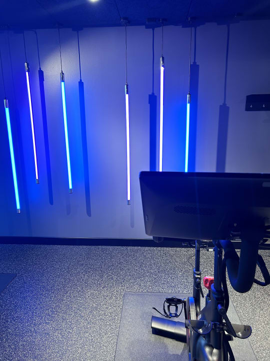 Fitnessraum, klein aber super ausgestattet, sogar mit Peloton Bikes
