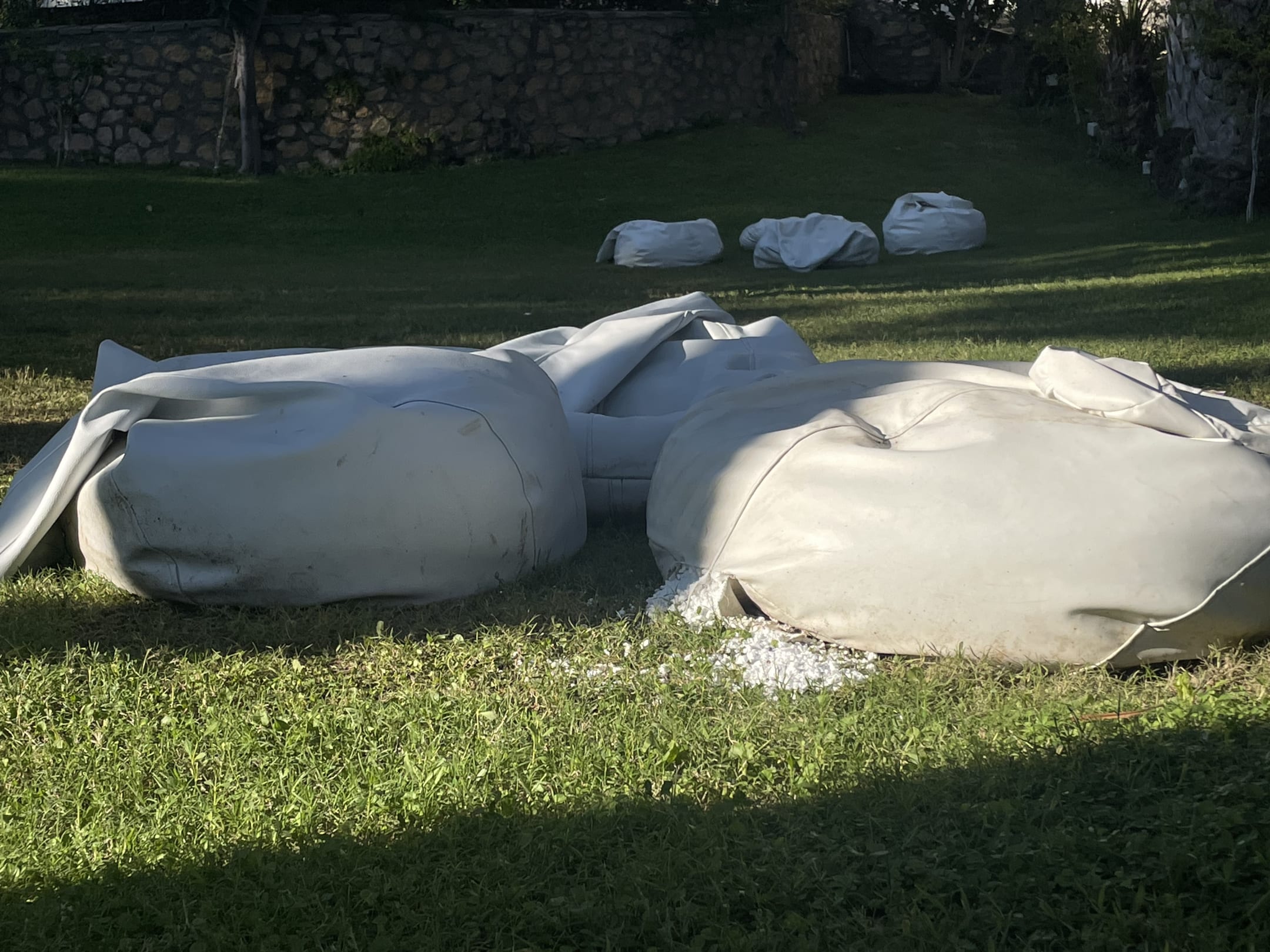 Defekte und dreckige Sitzsäcker im Garten