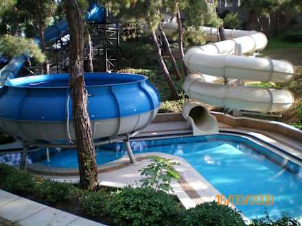 Rutschen im AquaparkDer hoteleigene Aquapark befindet sich unterhalb des Hotels bzw. der Villen eingebettet in einer wäldlichen Landschaft - Die blaue Rutsche endet mit dem abgebildeten "Trichter", darin dreht man seine Runden und fällt irgendwann durch die Öffnung in das Becken - Einzigartig!