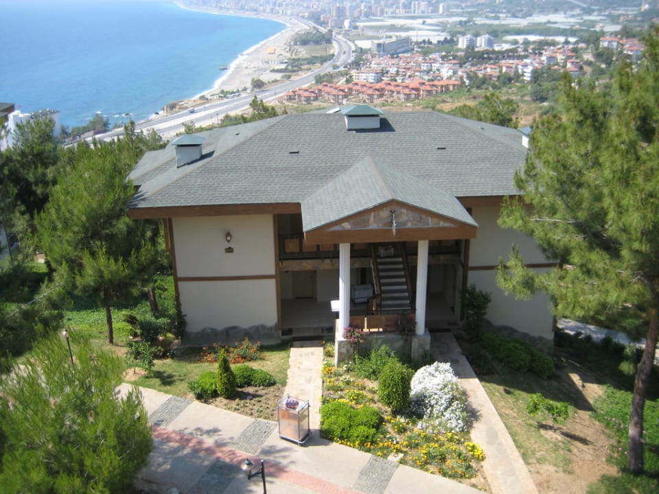 Villa in gepflegter Gartenanlage und Bucht Richtung Alanya im Hintergrund