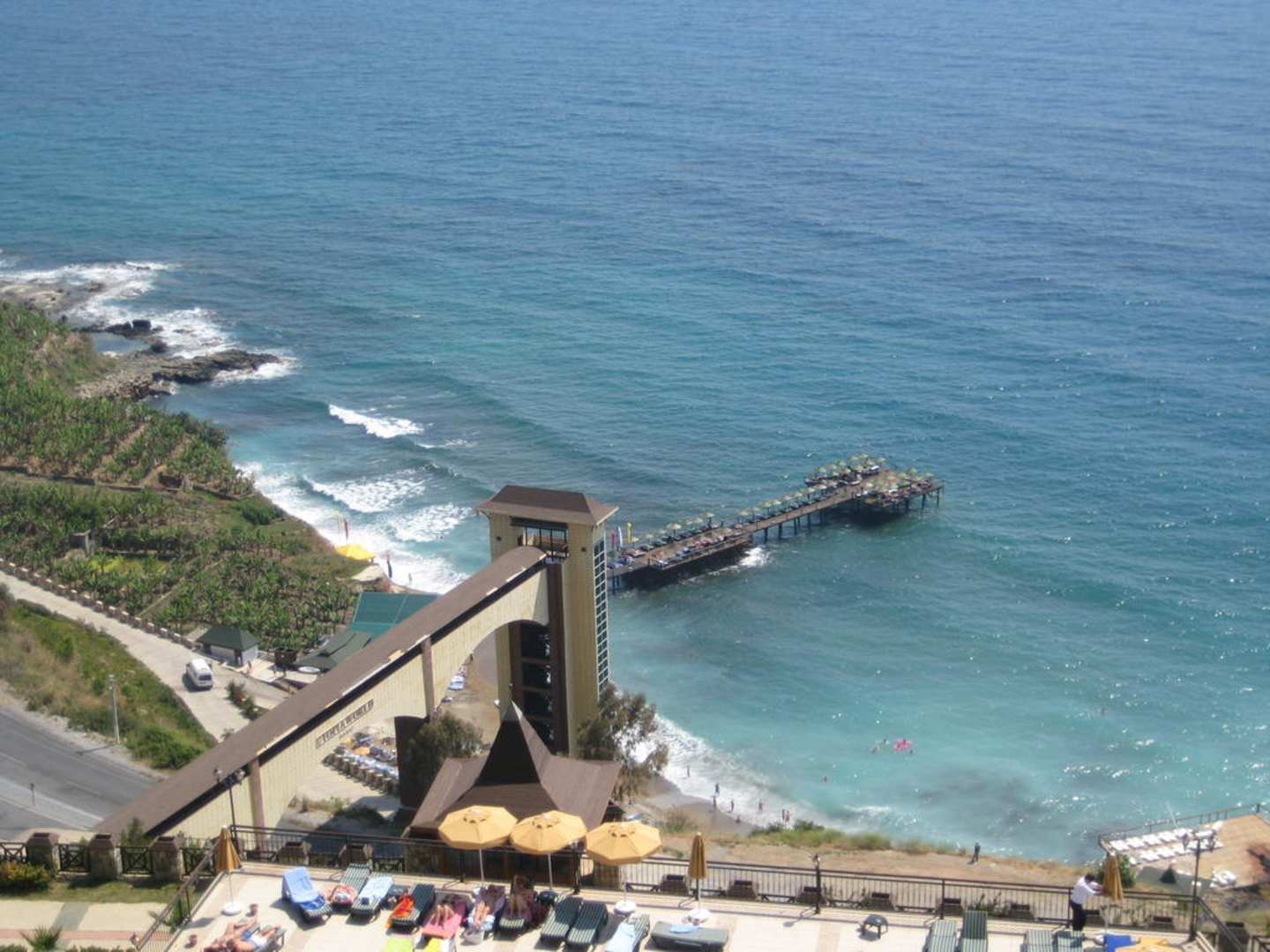 Mittig Holzbrücke mit Aufzug zum Strand