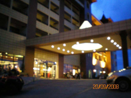 Überdachter Hoteleingang am Abend mit integrierten Wendekreis für Reisebusse usw.