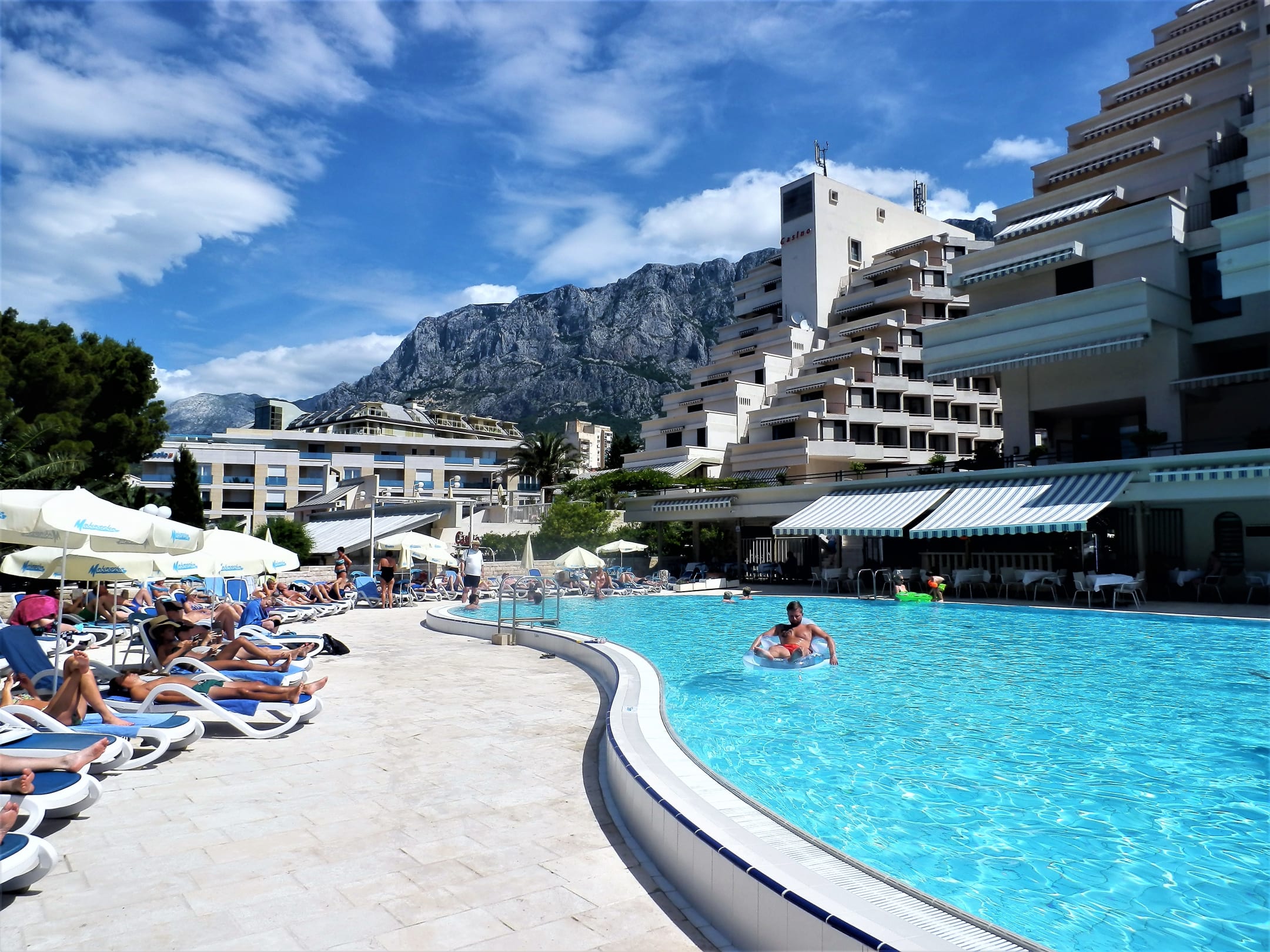 Pool mit Ausblick auf das Hotel und das Gebirge