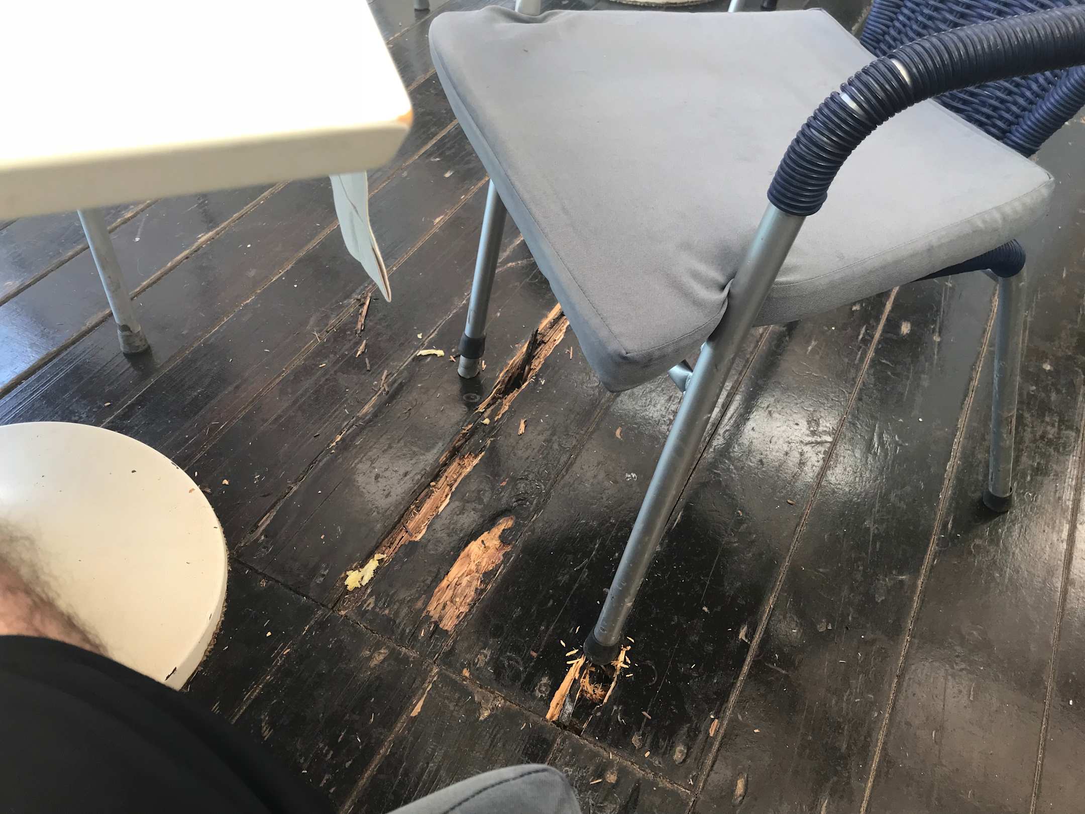 Sitzgelegenheiten im Pool-Restaurant: Morsche Dielen eingebrochen.
