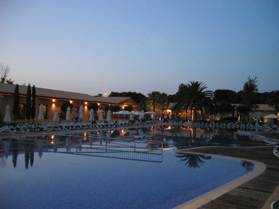 Der große Pool mit dem Kinderbecken (im Vordergrund) in Abendstimmung.
