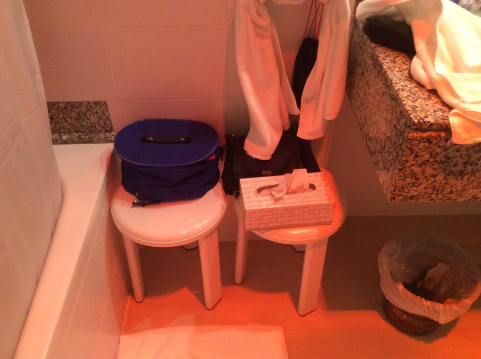 Hocker als Ablagemöglichkeit im Bad.