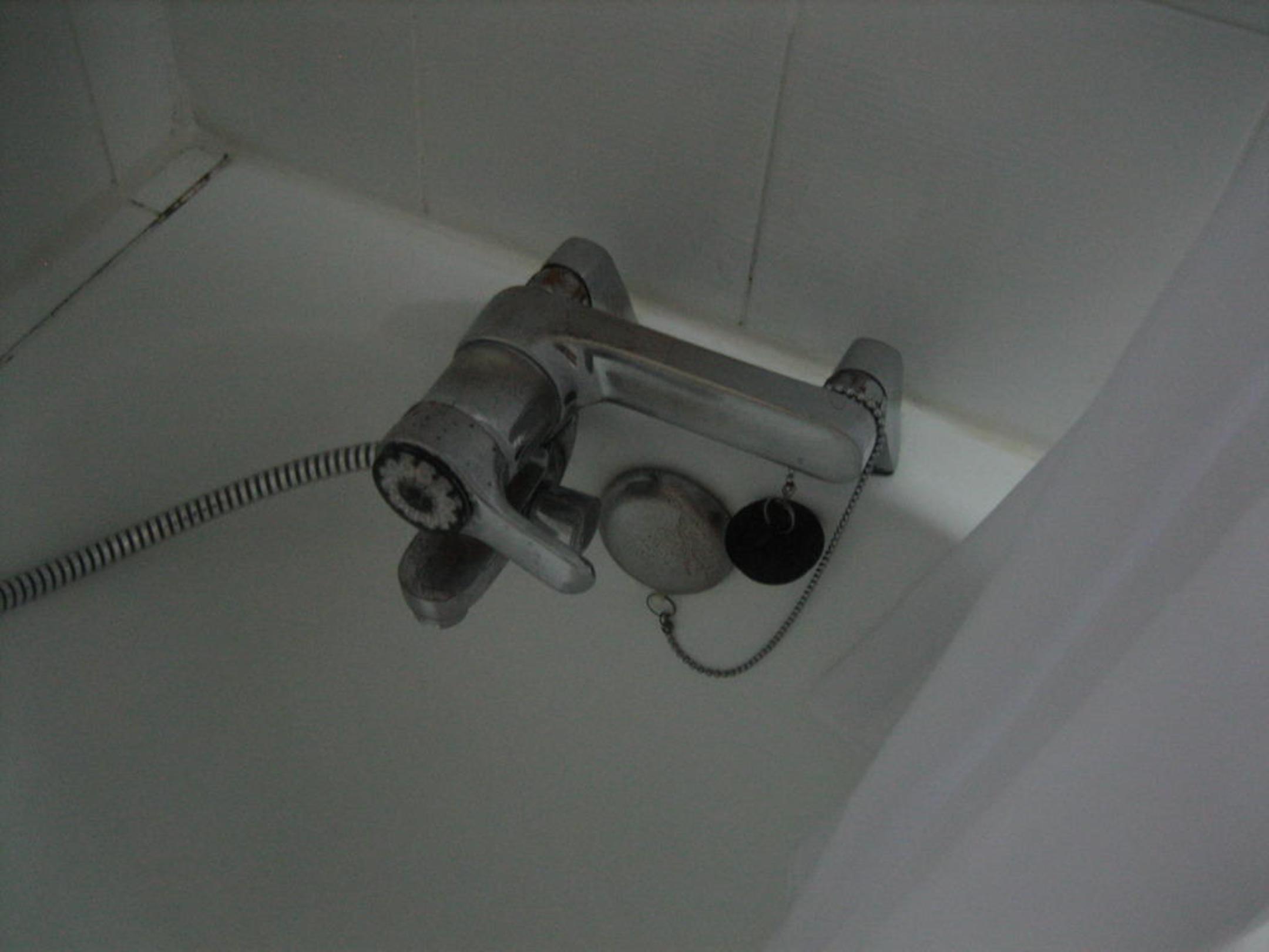 Armatur mit Rotflecken. Schwarze - eigentlich Weise - Fugen um die Badewanne - ebenfalls NO GO!