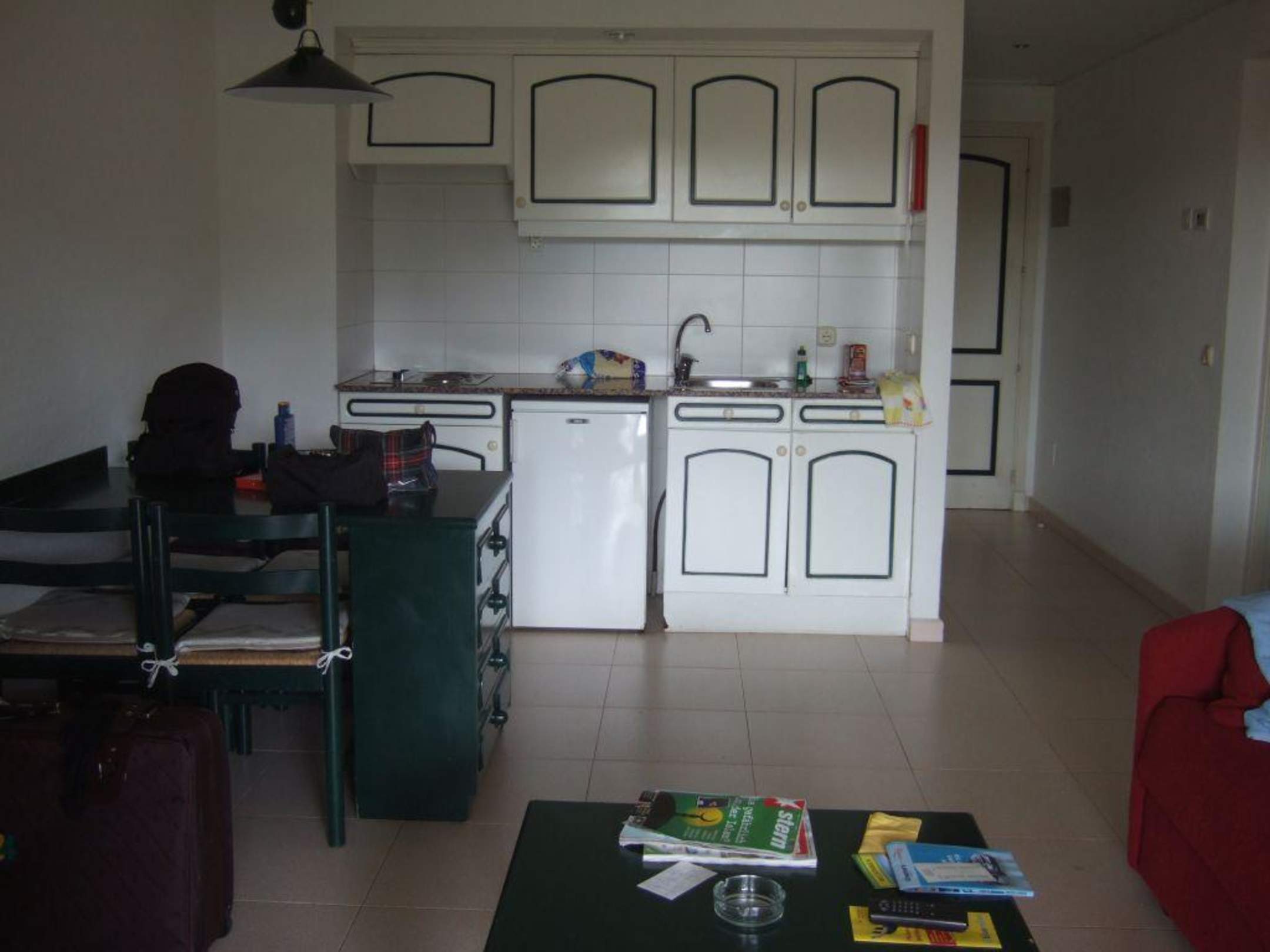 Blick in den Wohnbereich mit Kitchenette2 Kochplatten,el. Wasserkocher und Toaster,Geschirr, Gläser, alles da.