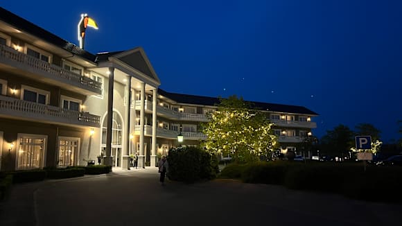 Der Hoteleingang am Abend