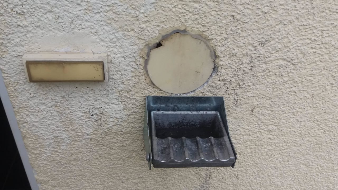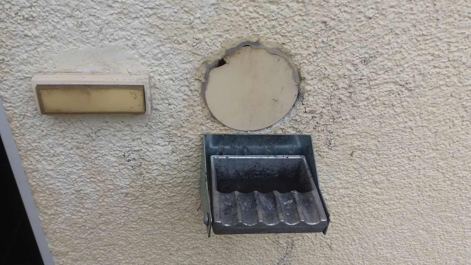 Eingangsbereich außen, Klingel und Ascher.