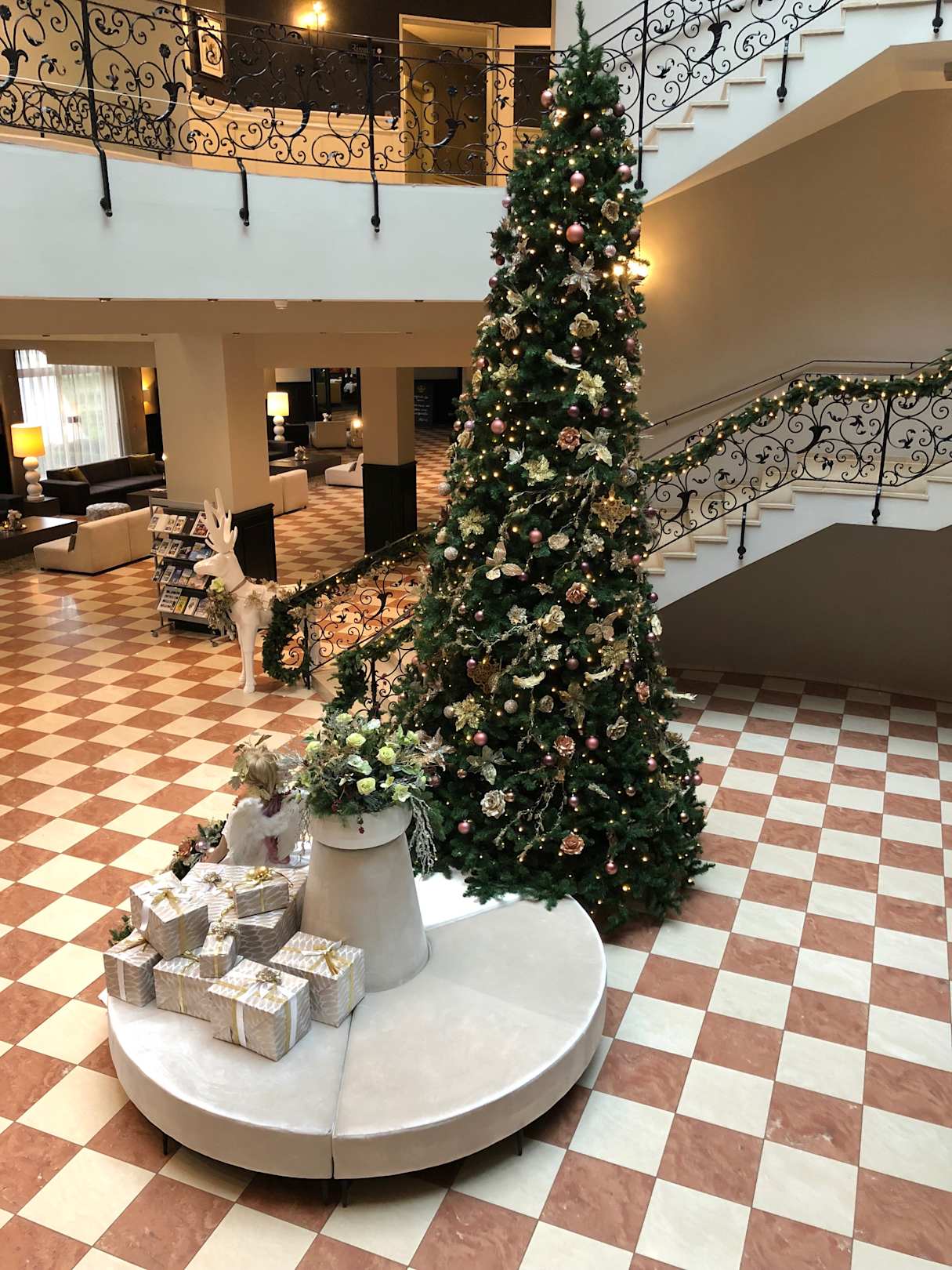 Sehr schöne und dezente Weihnachtsdeko in der Lobby - einmal von der Treppe aus