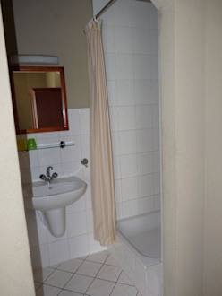 Dusche im Schlafzimmer eines Appartmentssehr kleines Badezimmer, welches direkt ins Schlafzimmer integriert wurde