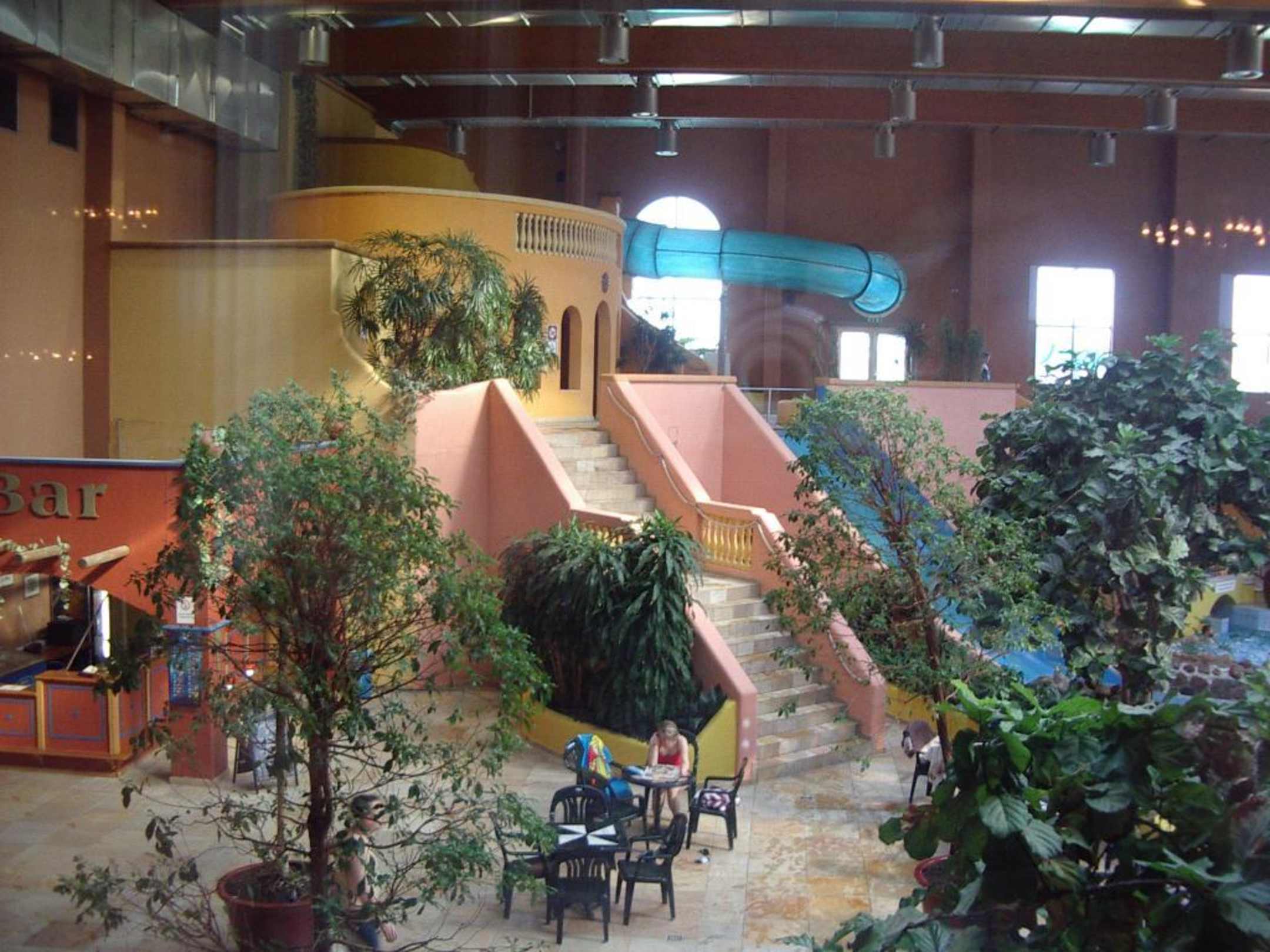 Hier eine weitere Ansicht aus dem Spaßbad im Van der Valk Resort Linstow. Hier sieht man die Aufgänge zu den zwei langen Röhrenrutschen, dem Außenbereich mit Wildwasserkanal und Whirlpool und zum Wärmestrahlungsraum.