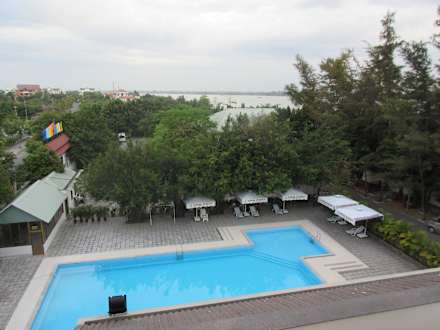Blick aus Hotelzimmer auf Pool und Mekong