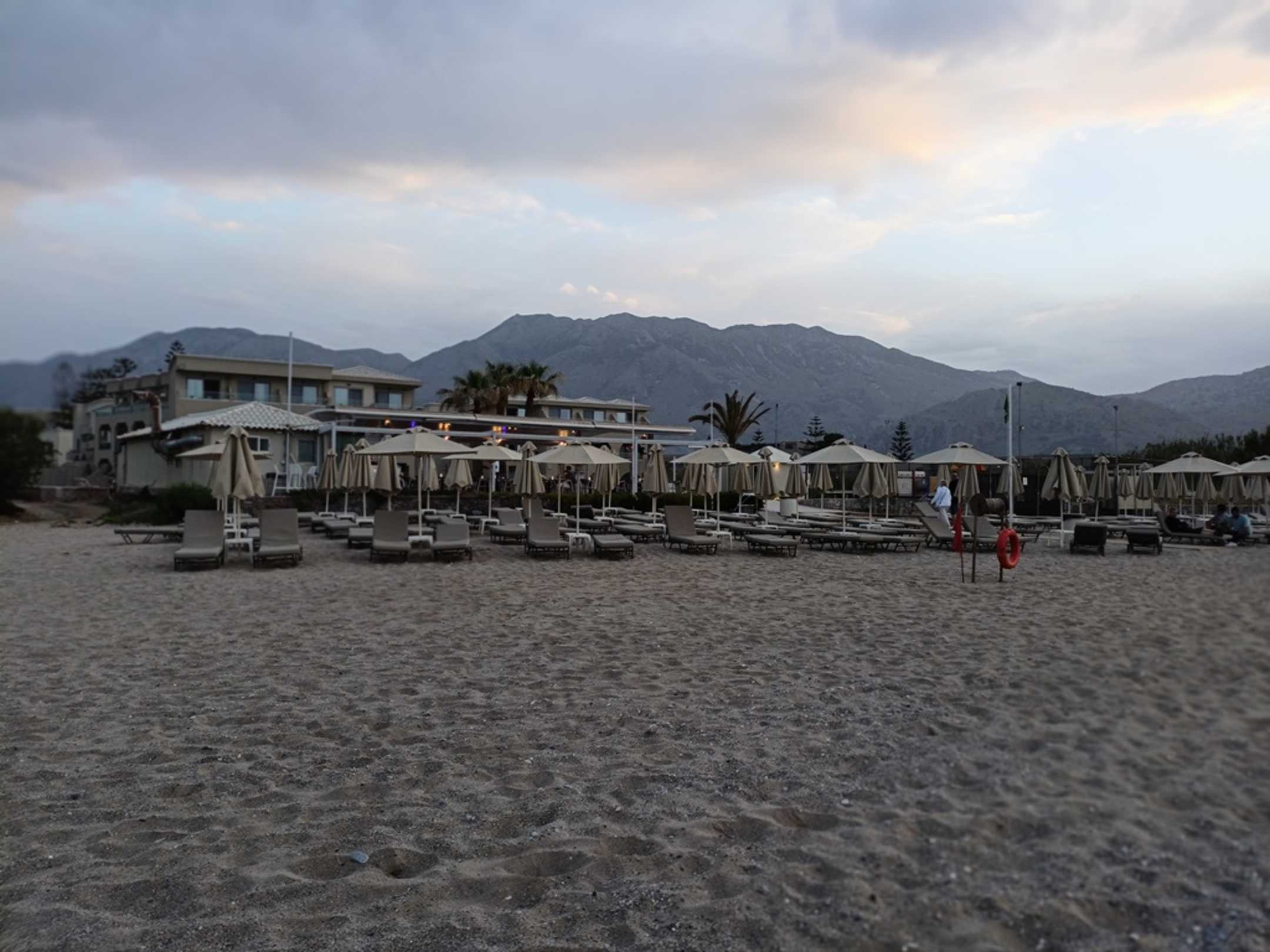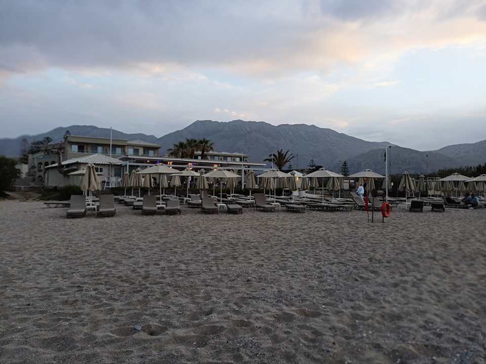 Blick vom Strand auf das Hotel. Abendstimmung im Mai.