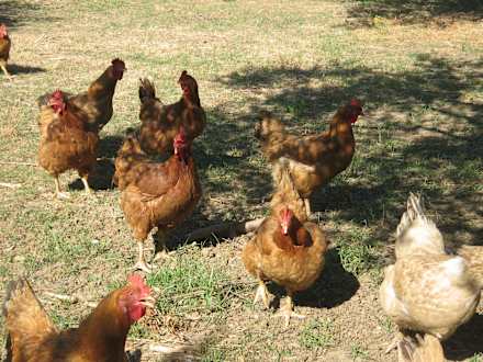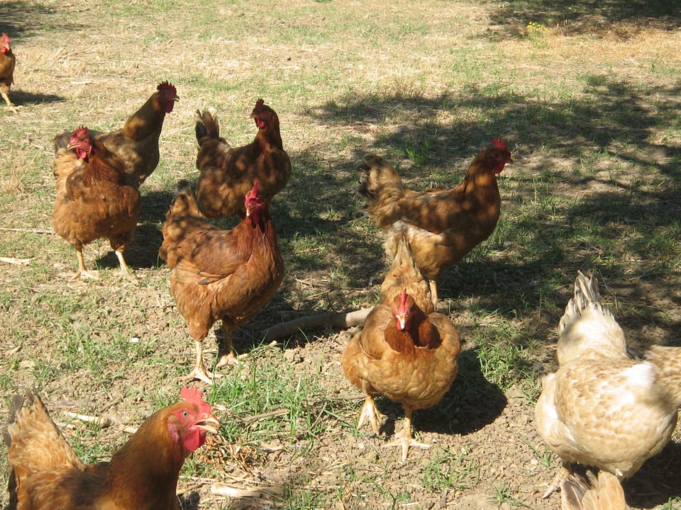 Glückliche HühnerVermutlich gehören zu ihrem artgerechten Futter auch die vielen Zikaden, die in der Frühe immer auf dem Boden zu sehen waren :-) .