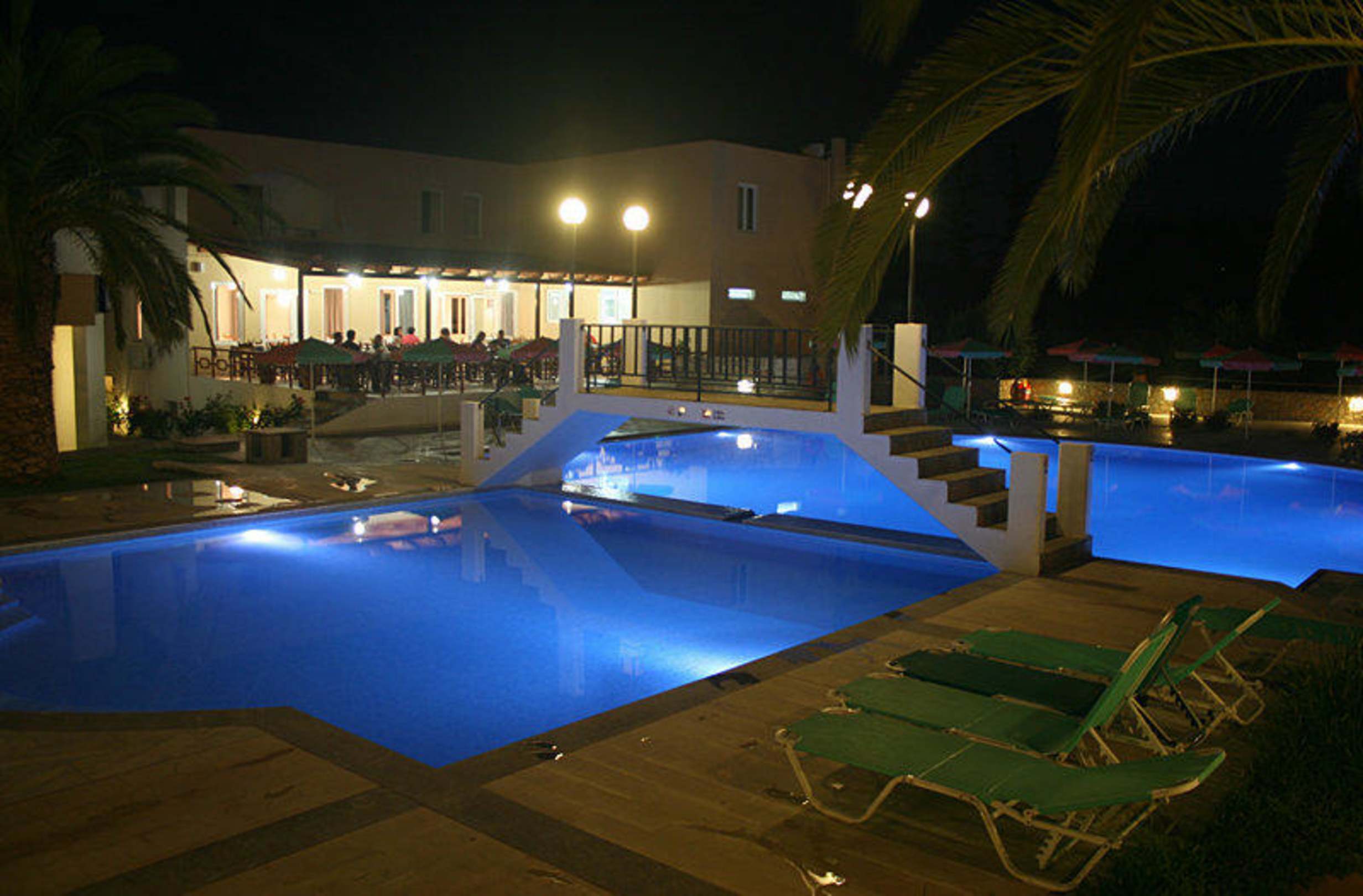Der Blick führt auf das Restaurant, welches ebenfalls über eine Terasse verfügt. Dort wird gefrühstückt und zu Abend gegessen.