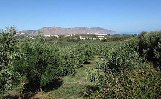 In der Bildmitte die aus einzelnen Bungalows bestehende Hotelanlage "Vardis Olive Garden" inmitten einer 100.000 qm großen landwirtschaftlichen Fläche der Eigentümerfamilie.