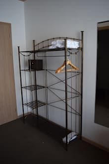 Kein Schrank im Zimmer, sondern nur eine Garderobe aus Metall...