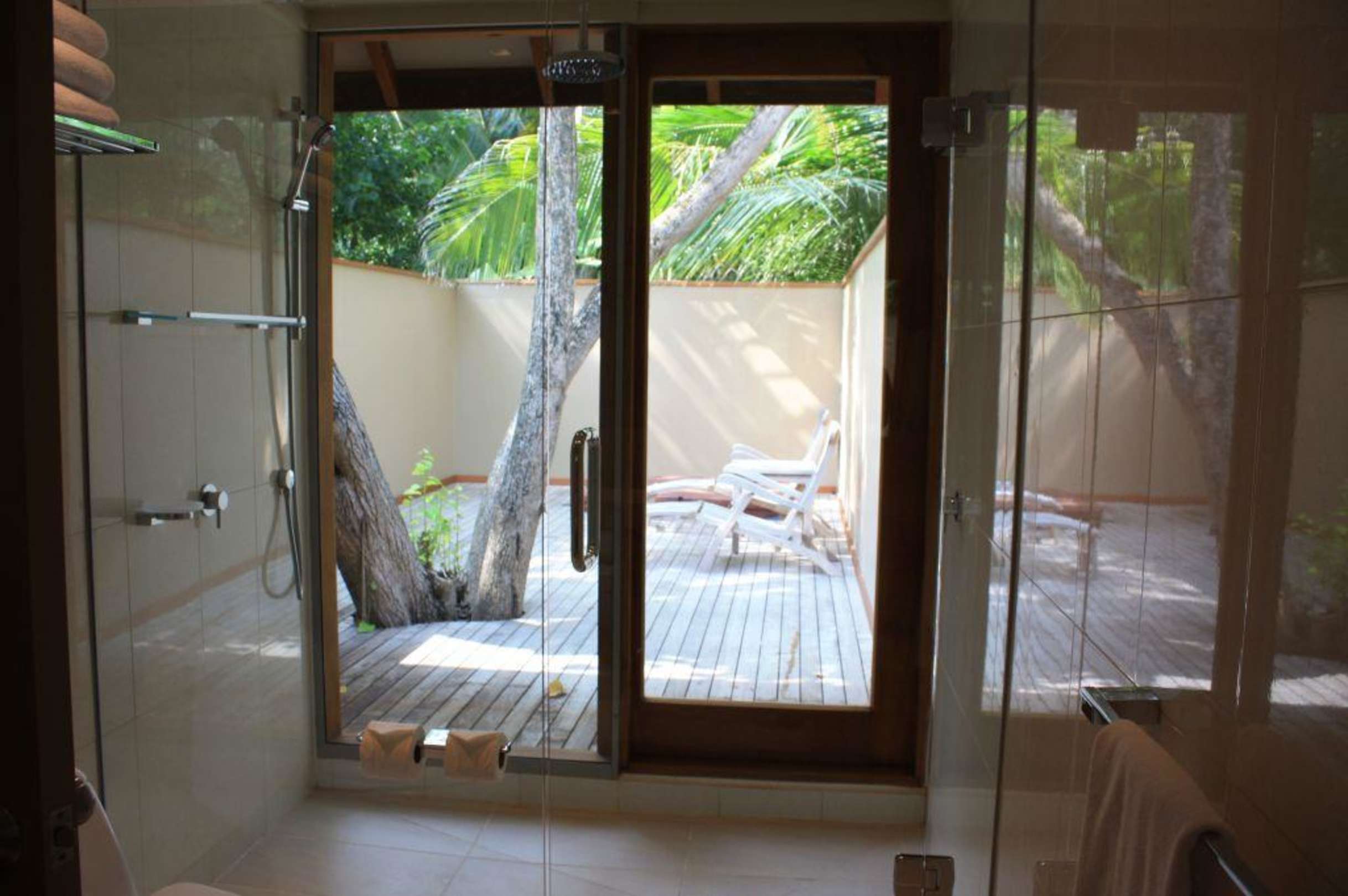 Das Badezimmer Beachbungi Nr. 117Blick nach draussen zum privaten Aussenbereich mit Jacuzzi