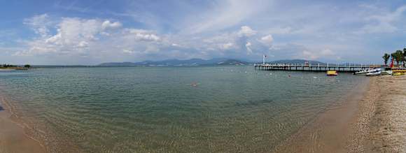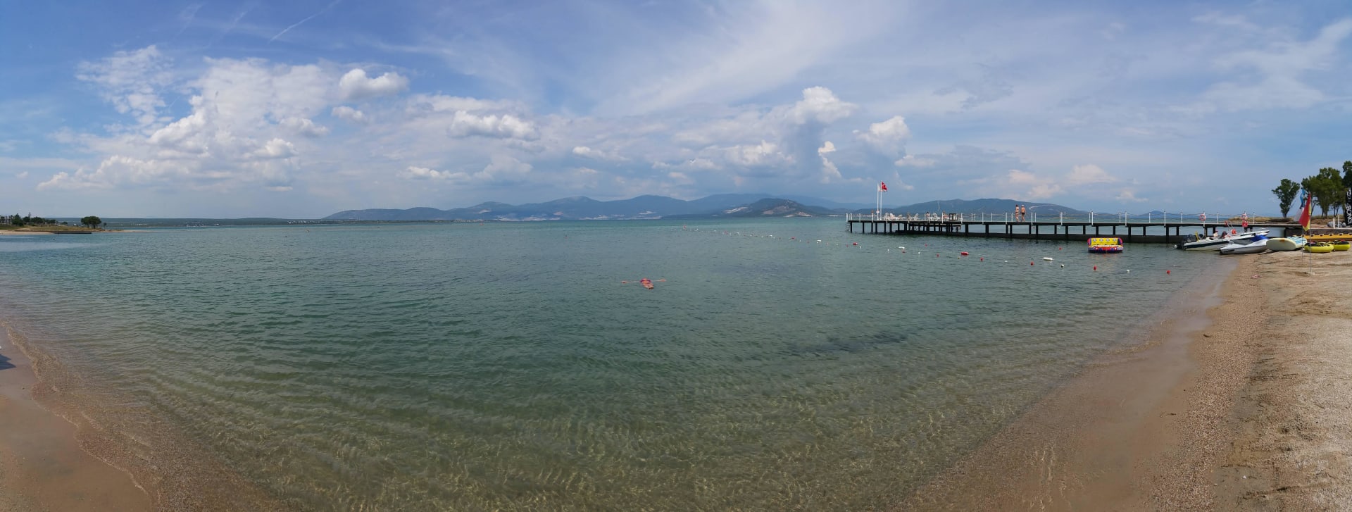 Rechts sieht man den Steg und das Angebot vom Wassersport-Anbieter. Flach abfallendes Meer. Der Bade-Bereich ist mit Schwimm-Bojen gekennzeichnet.