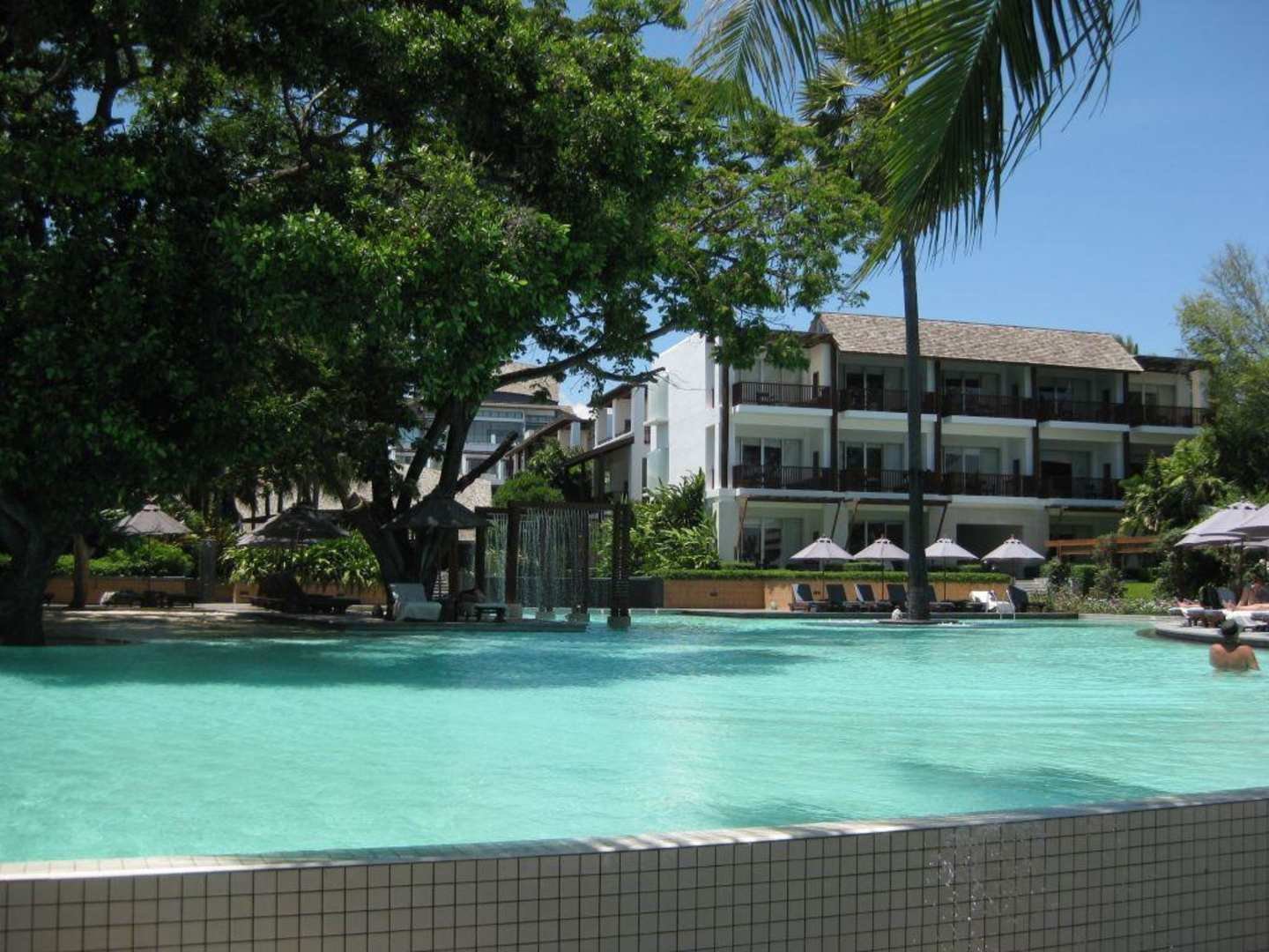 Blick vom Strand auf den Pool und im Hintergrund das Hotel